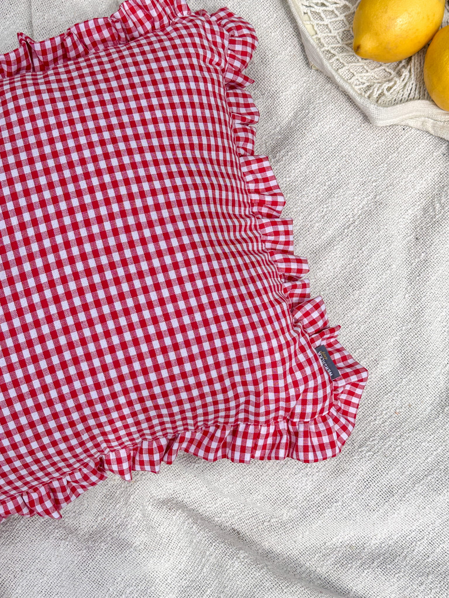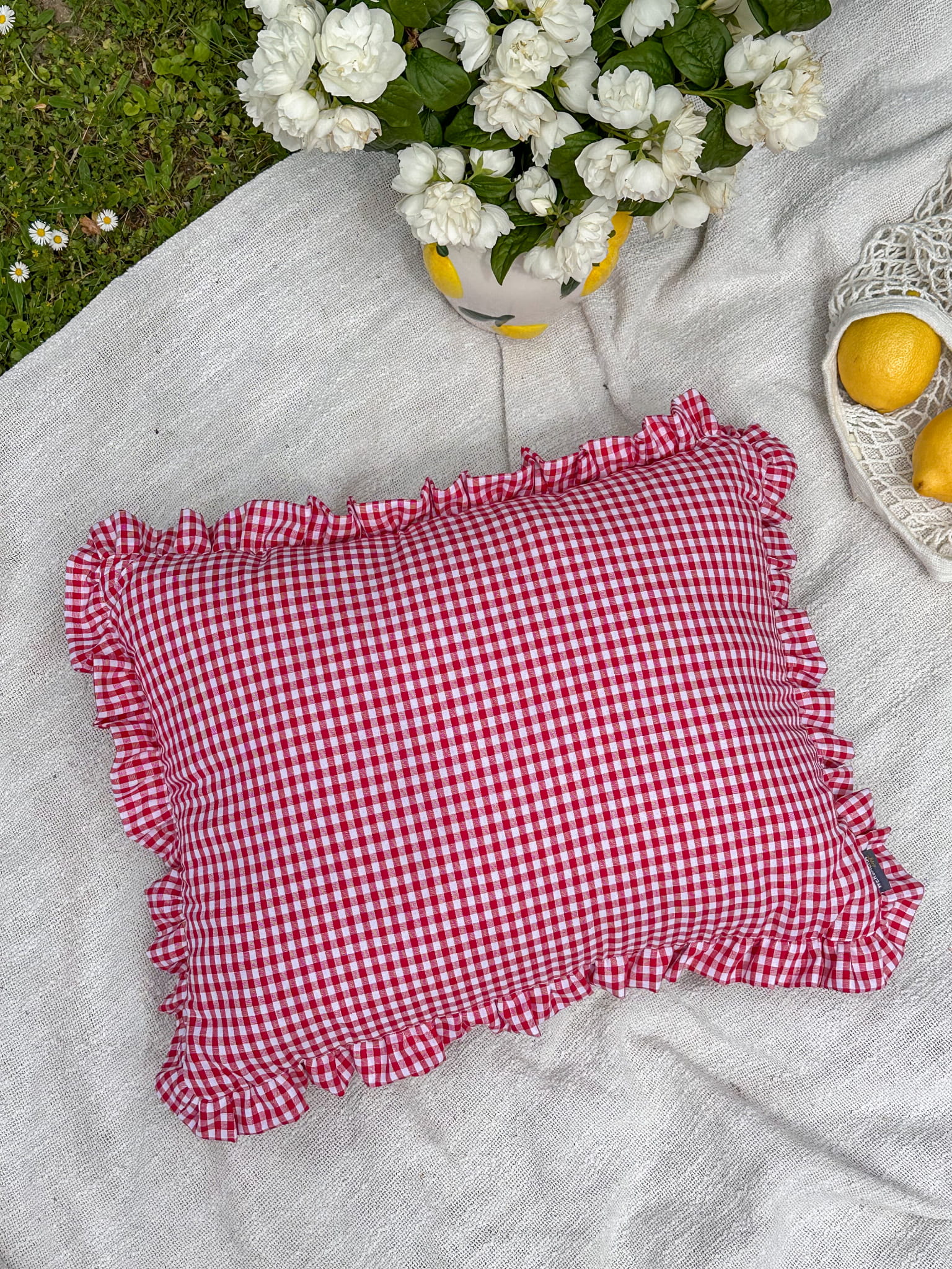Poduszka 40x50 cm z biało-czerwoną kratką i falbaną. Sprzedawana z wypełnieniem. Idealna do stylu cottagecore i rustykalnego.