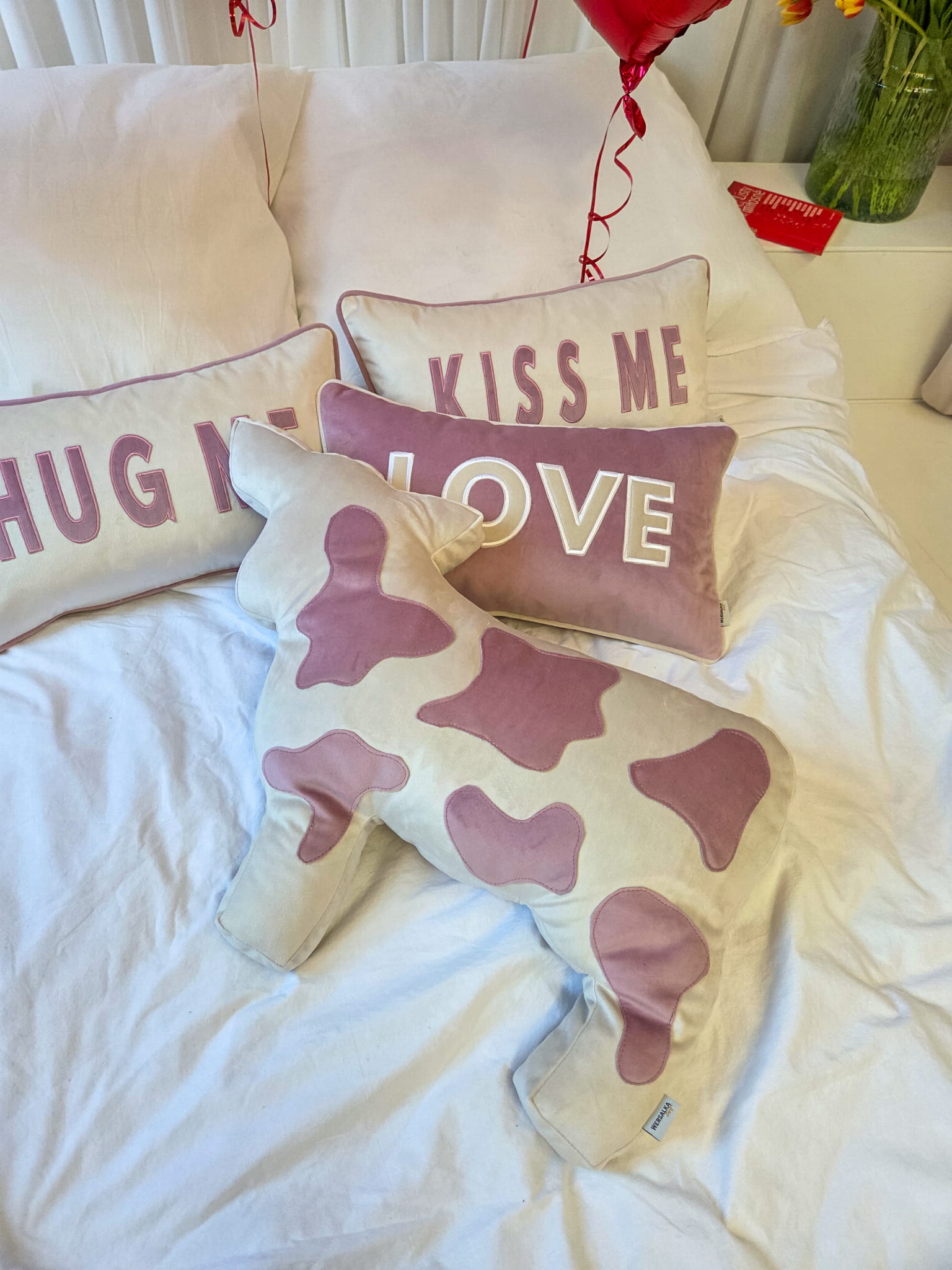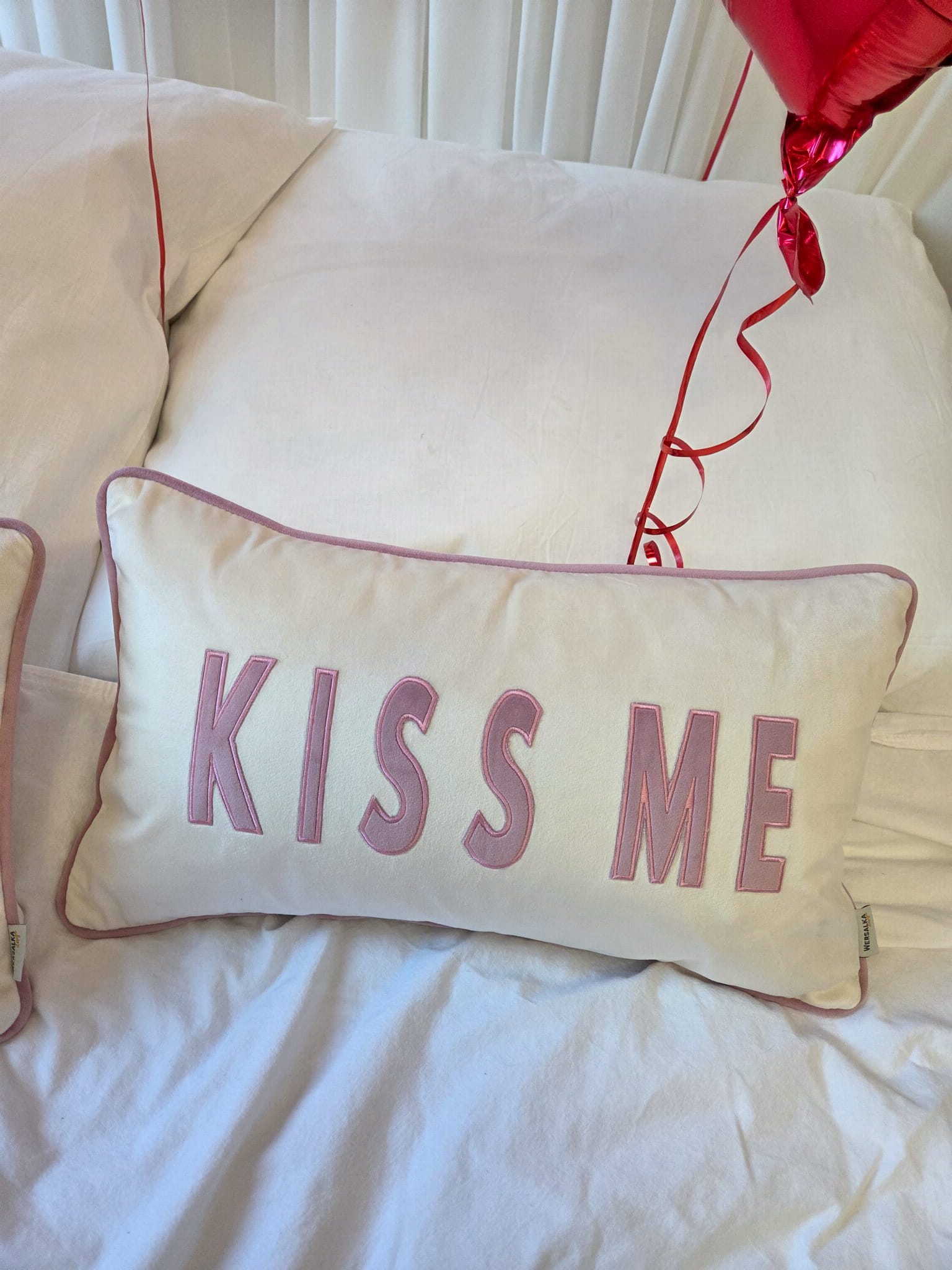 Pudrowy róż na białym tle? To połączenie zawsze się sprawdza! Ta urocza poduszka z napisem "Kiss Me" to świetny wybór do pokoju dziewczęcego, sypialni lub na prezent dla bliskiej osoby.