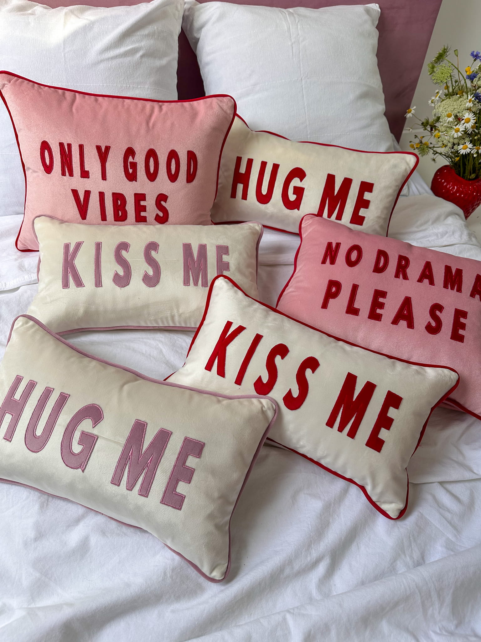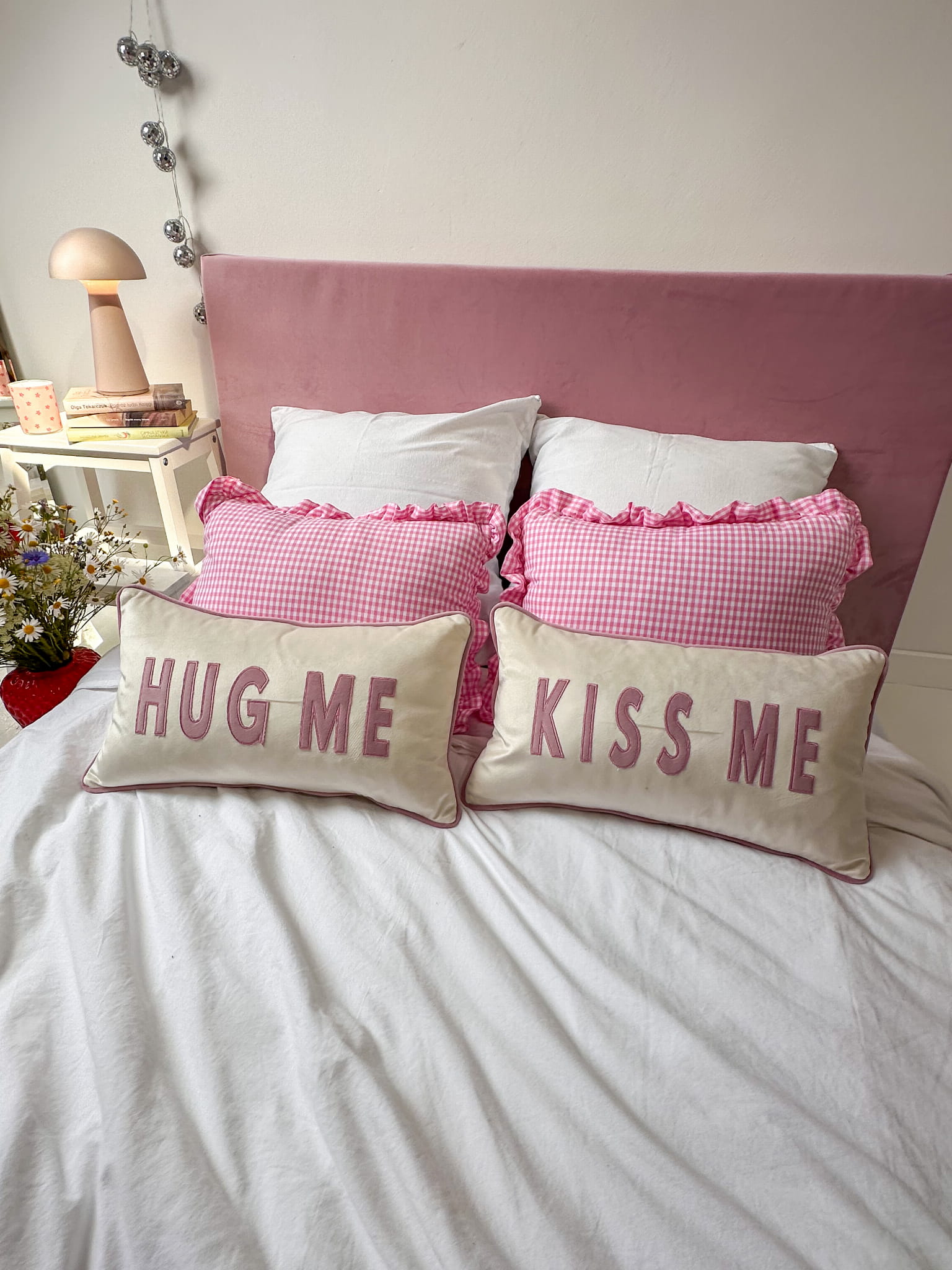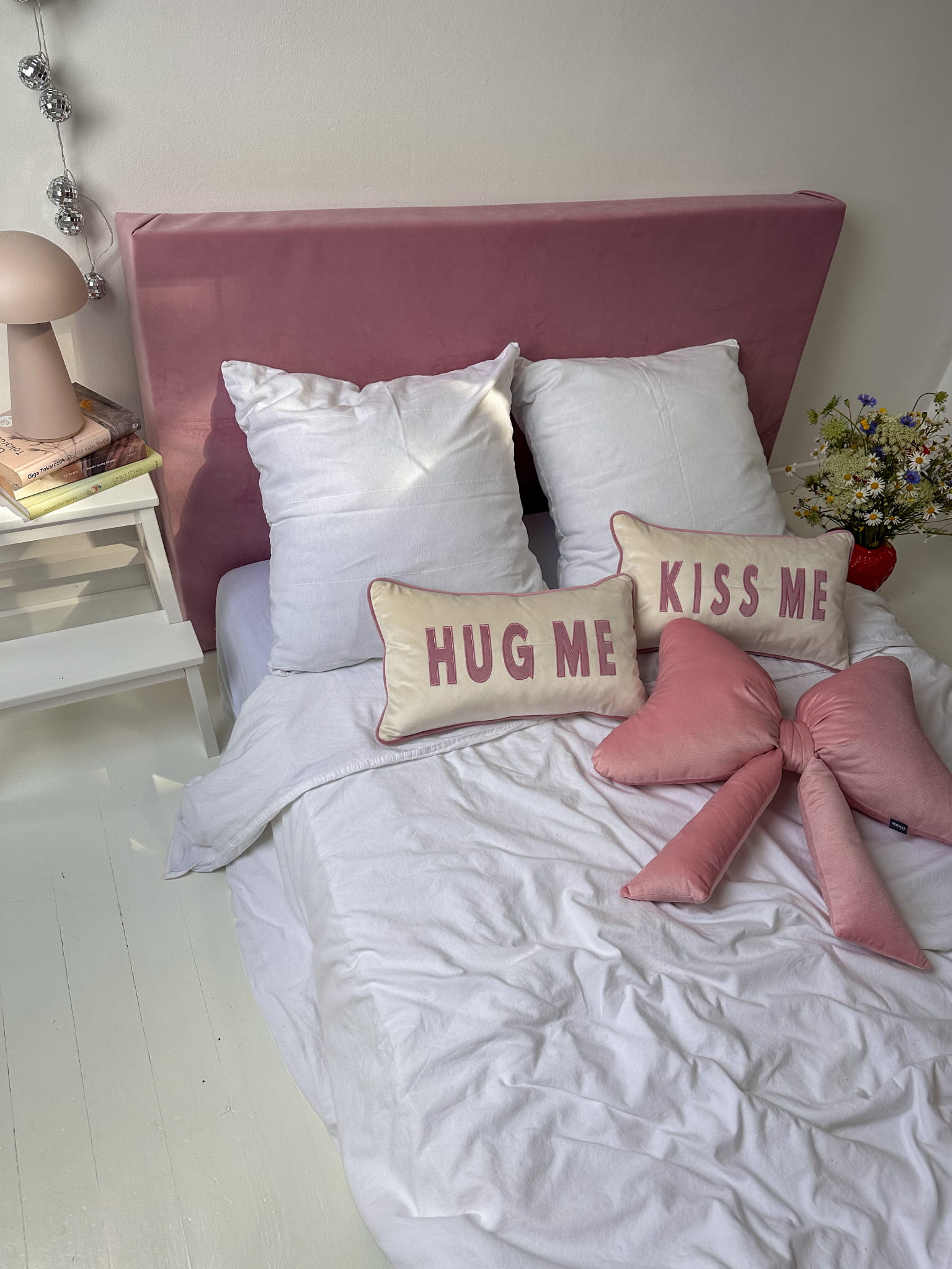Welurowa biała poszewka z napisem Kiss Me w pudrowym różu. Rozmiar 30x50 cm. Z wypełnieniem – romantyczna i miękka.