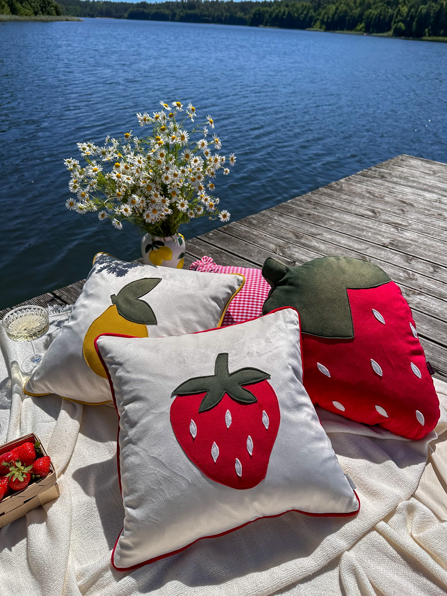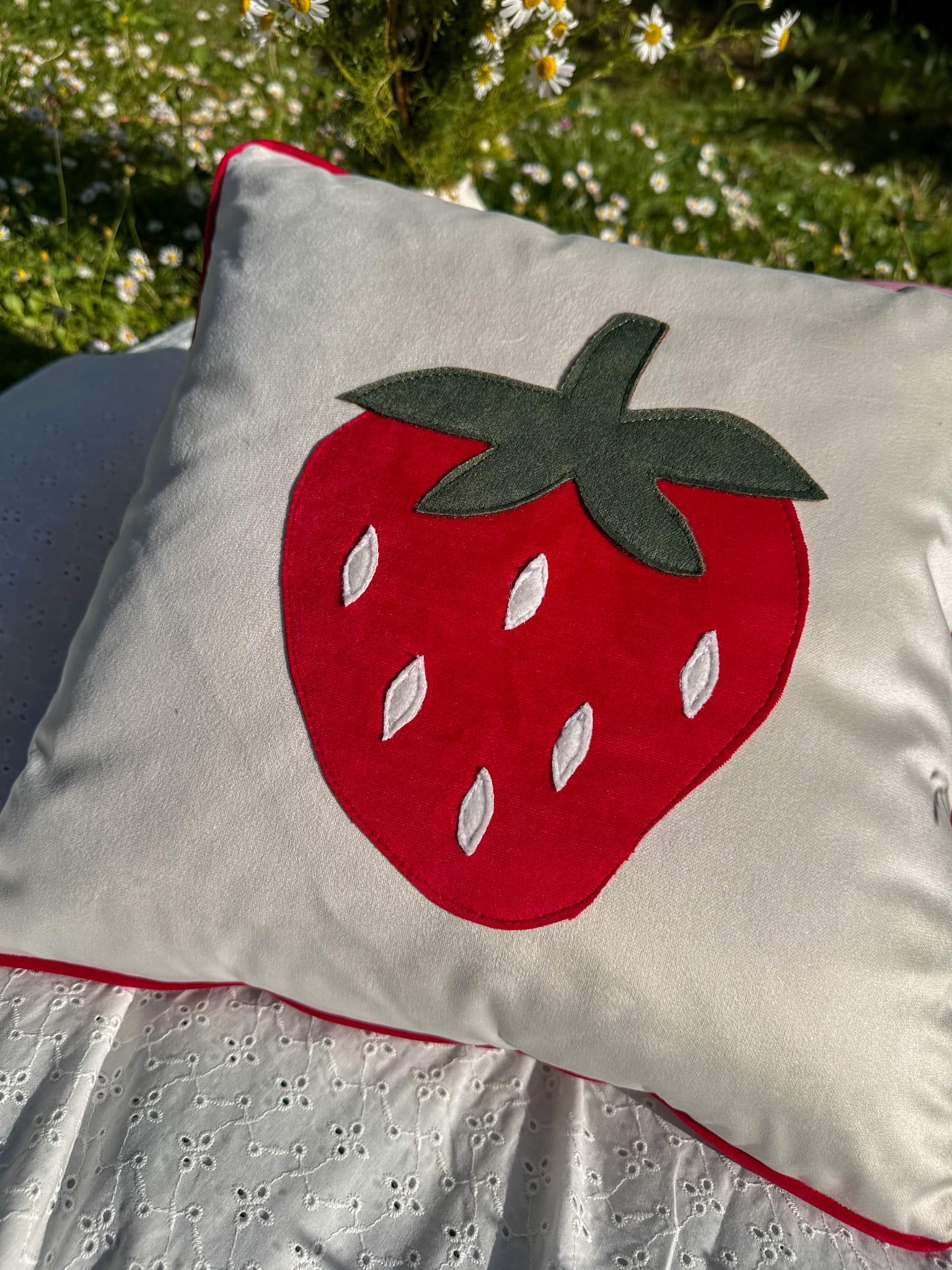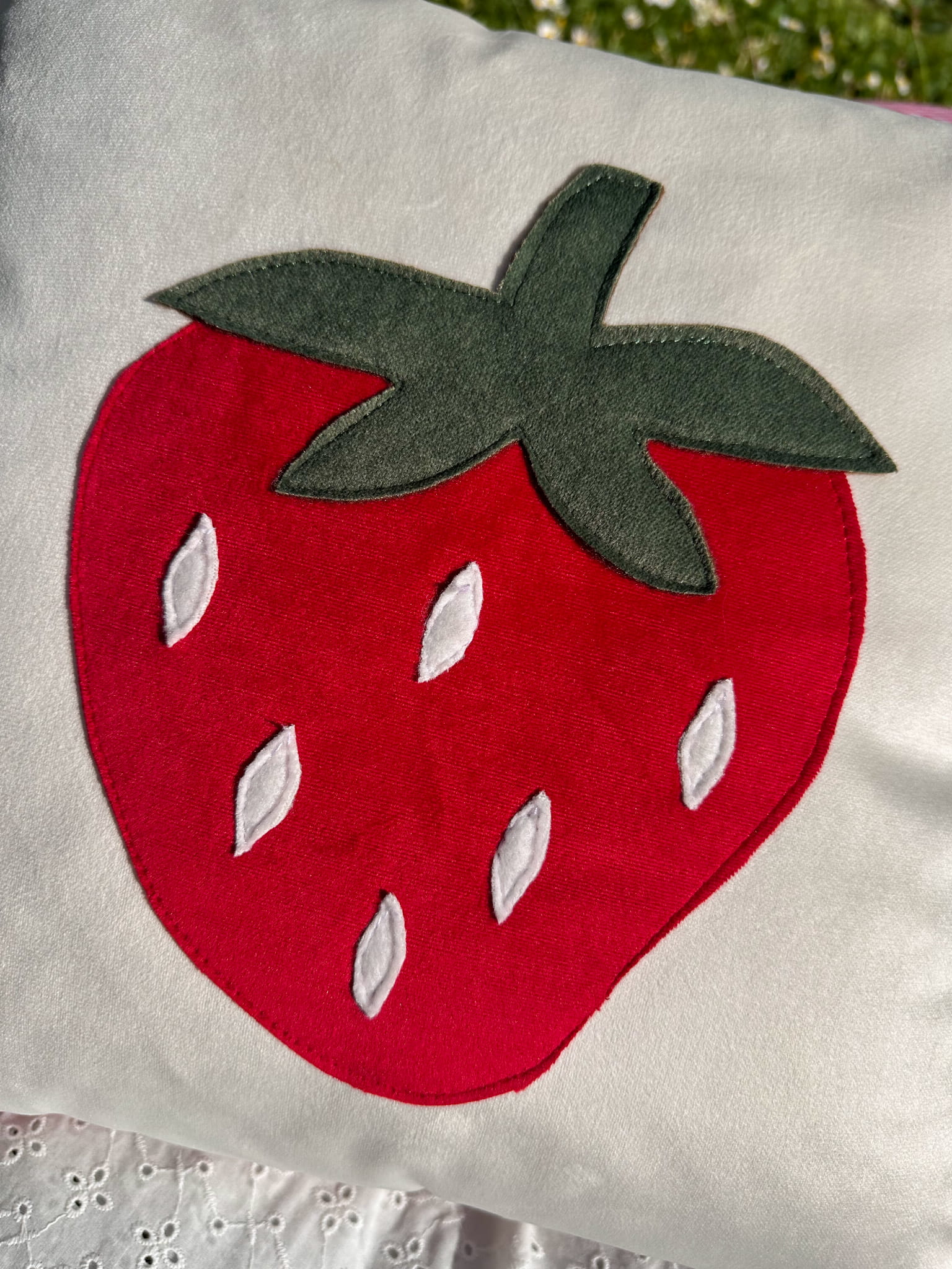 Biała poduszka dekoracyjna z naszytą truskawką 45x45 cm - z wypełnieniem