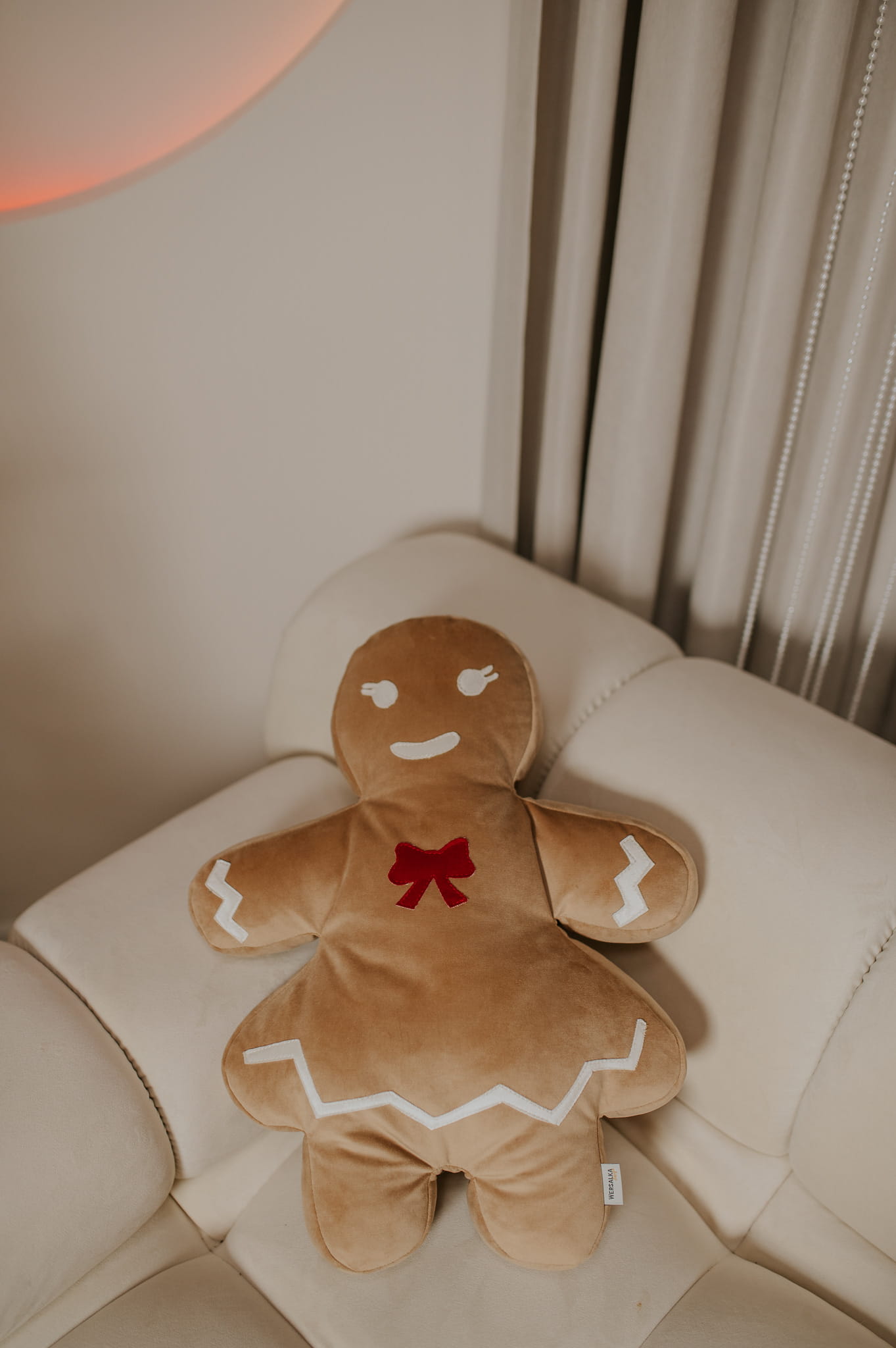 Miękka poduszka w kształcie piernikowej Pani Ciastek z beżowego weluru. Urocza, przytulna, idealna do zimowych dekoracji i prezentów.