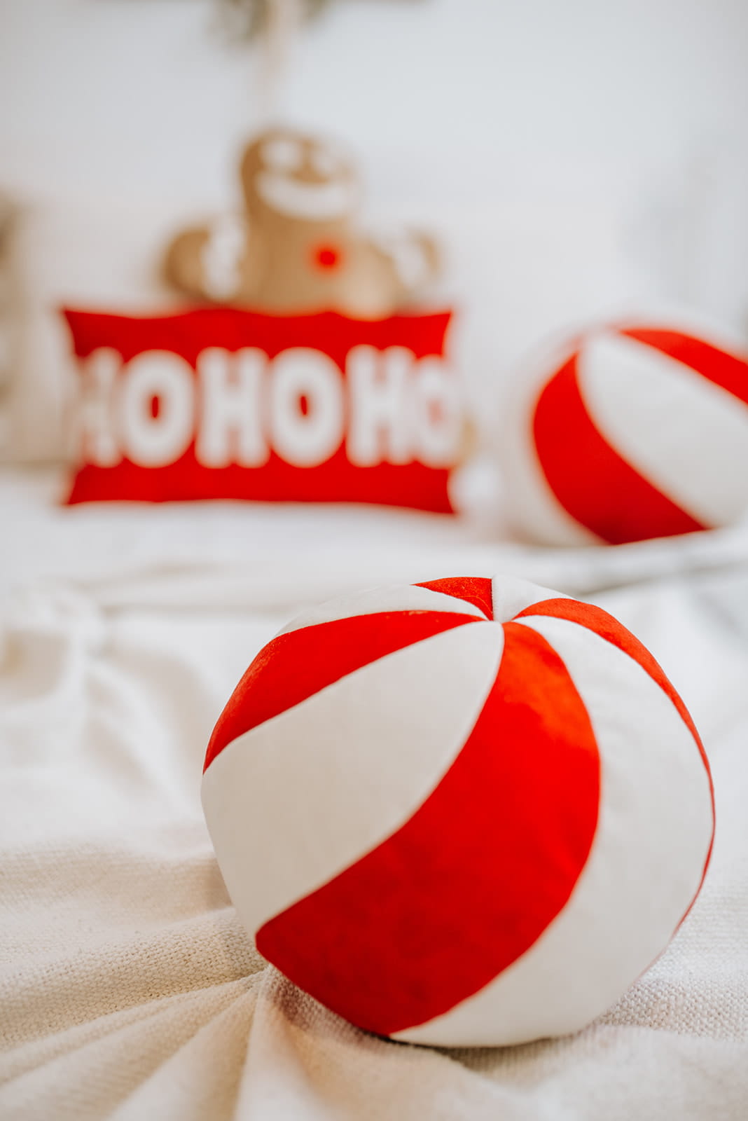 Dodaj świątecznego ducha do swojego wnętrza z naszą miękką poduszką w kształcie kulki. Idealna do dekoracji salonu, sypialni lub pokoju dziecięcego.