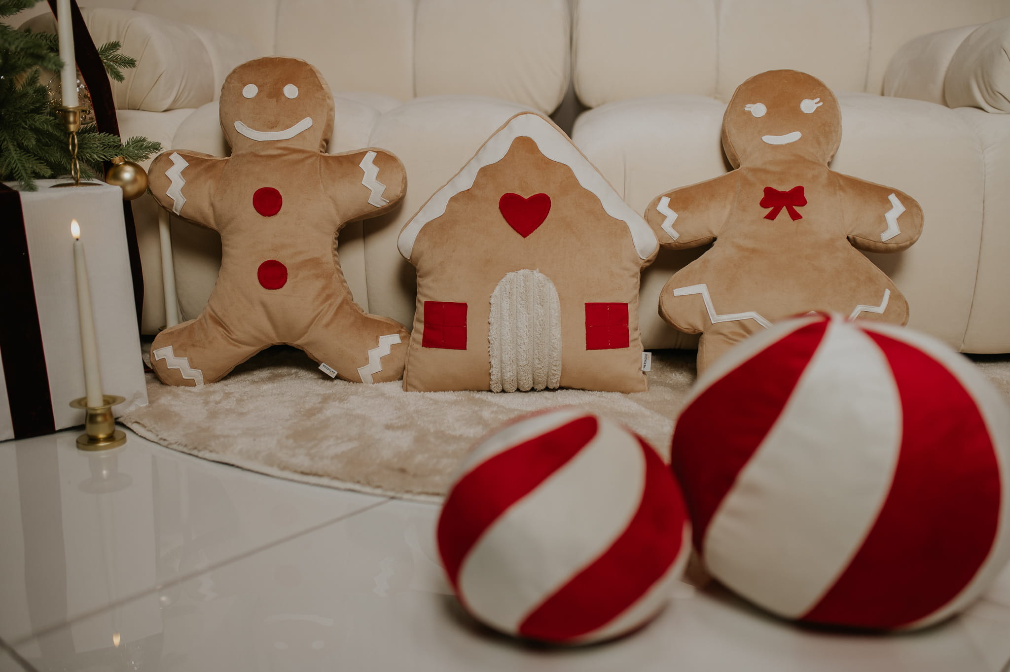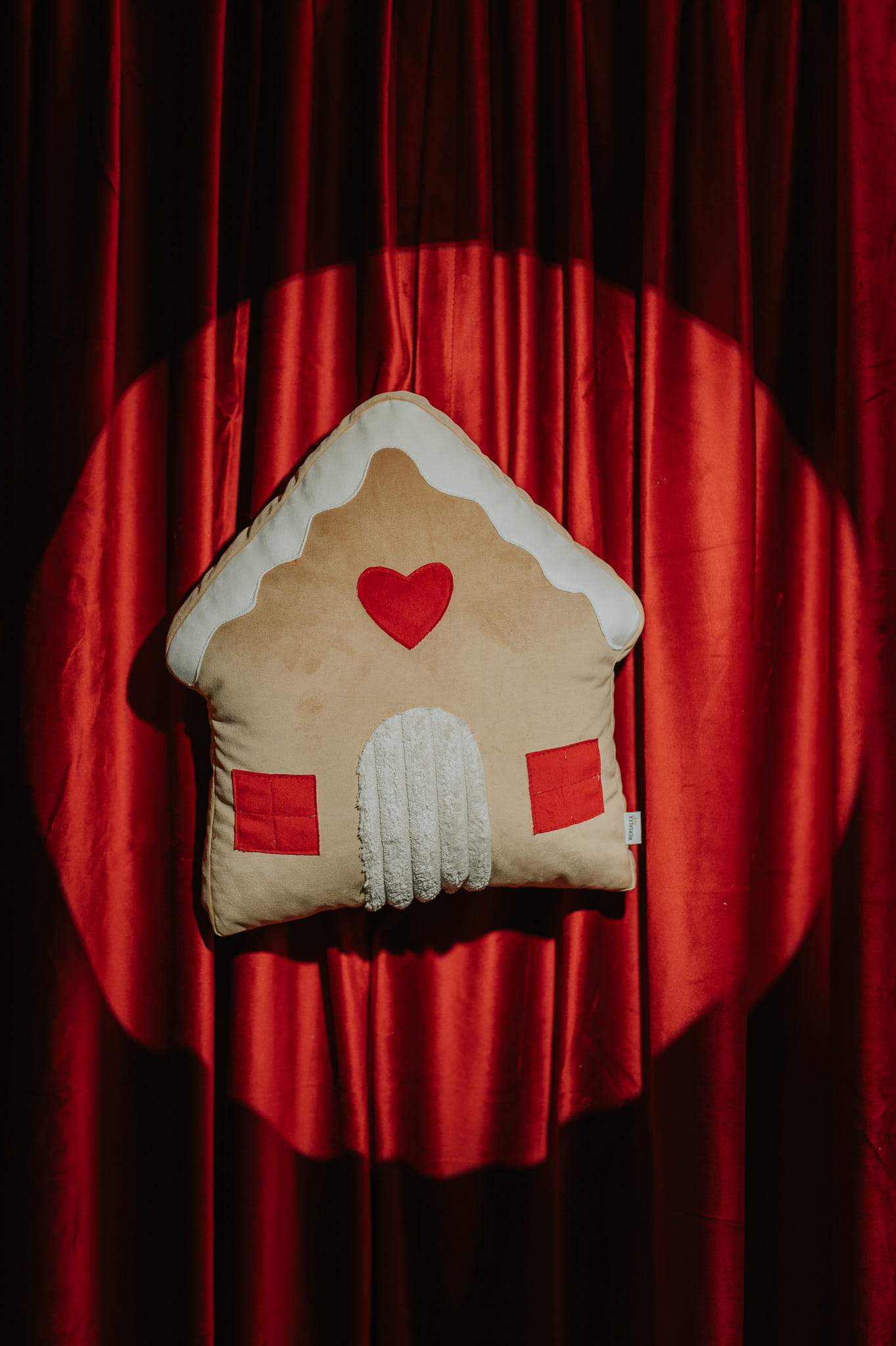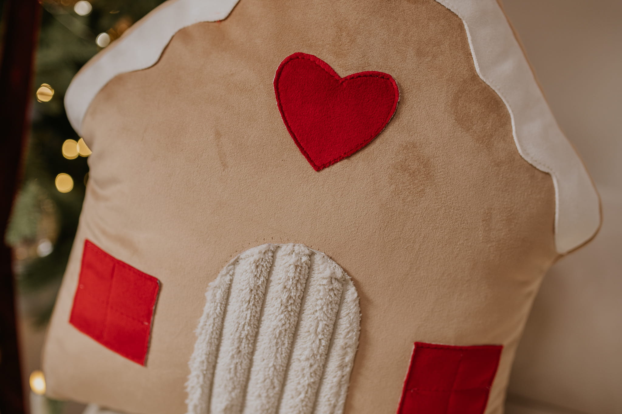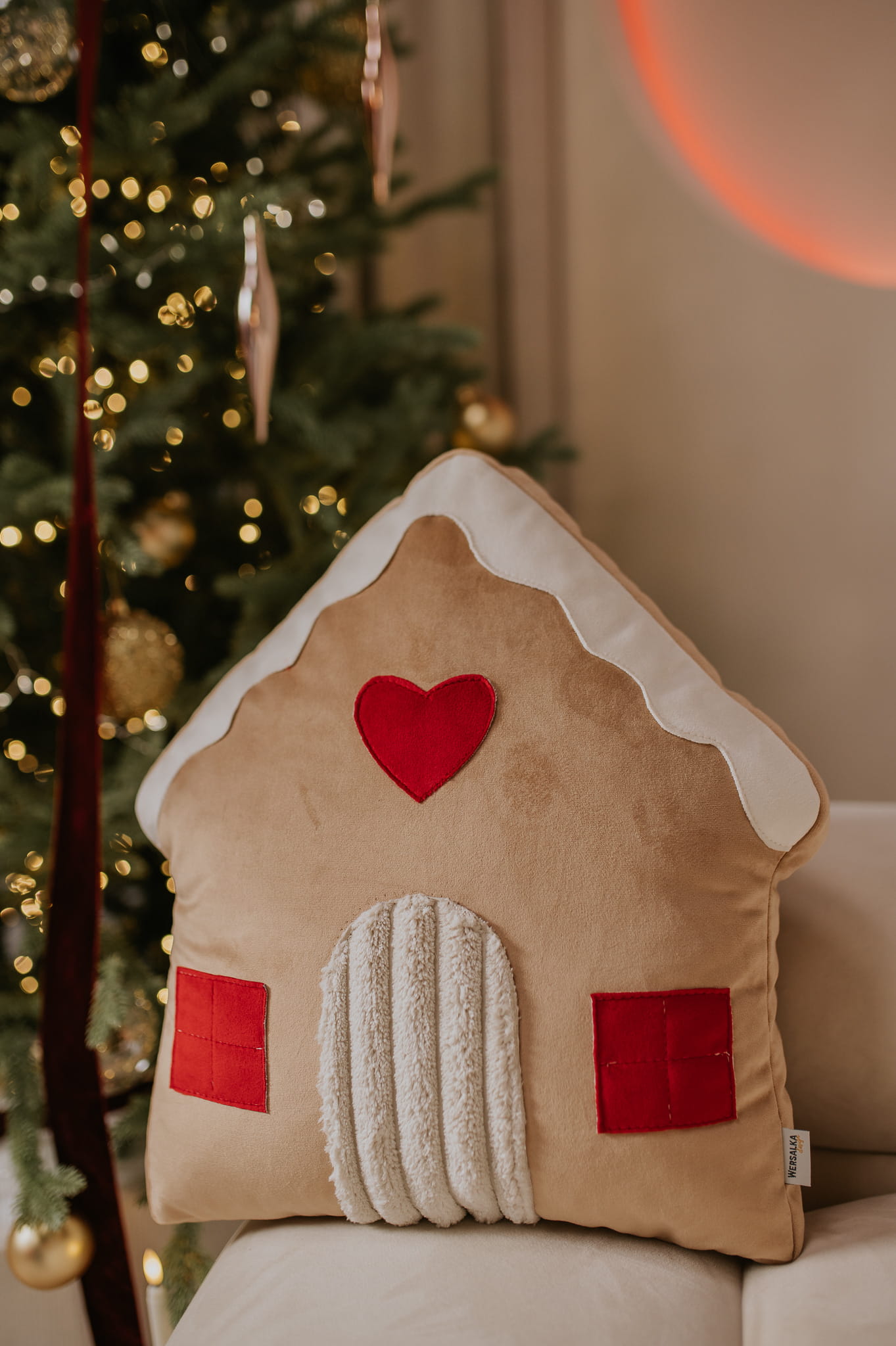 Poduszka w kształcie domku piernikowego z miękkiego weluru. Urocza, świąteczna dekoracja, która ociepla wnętrze i tworzy przytulny klimat.
