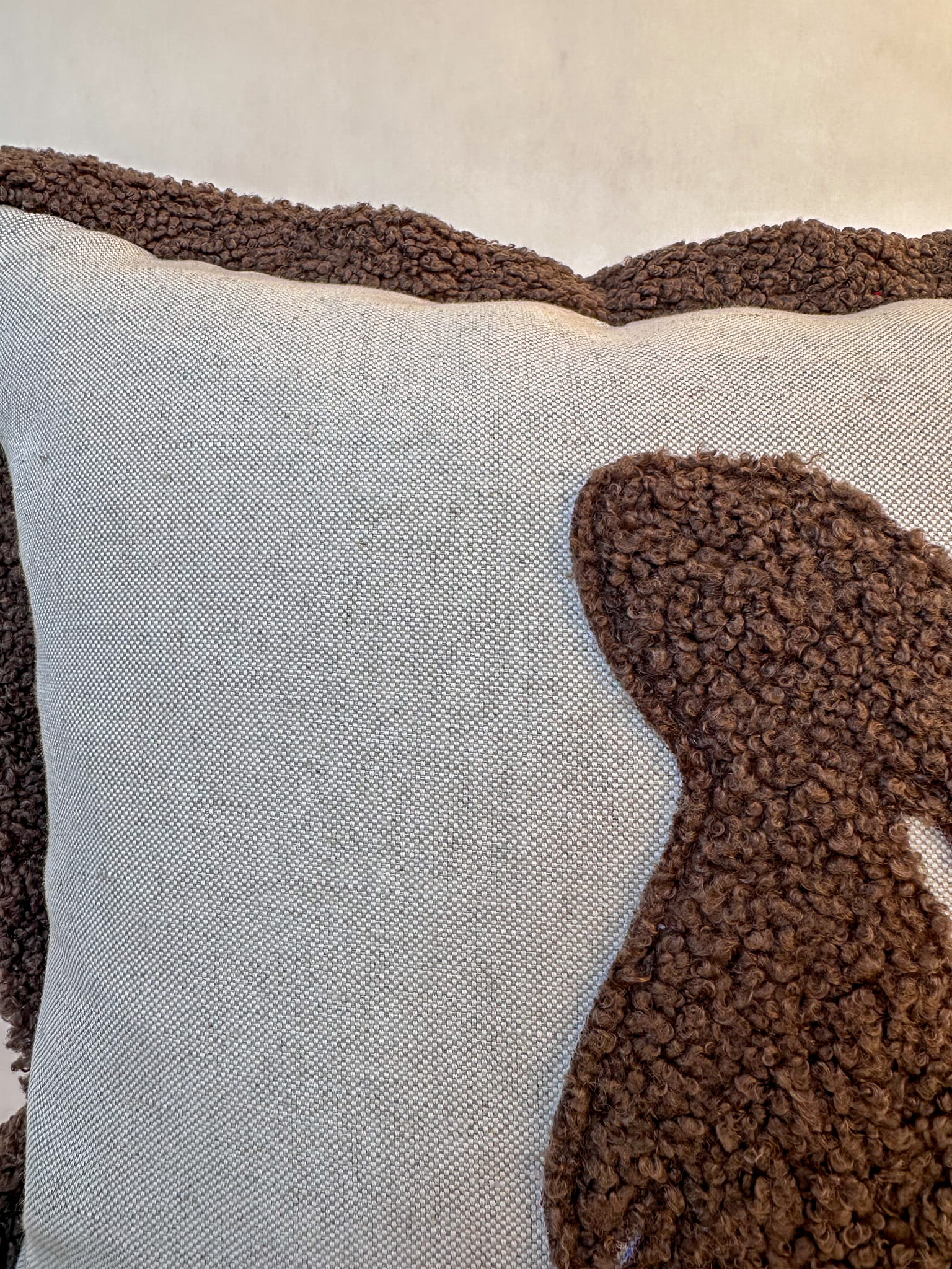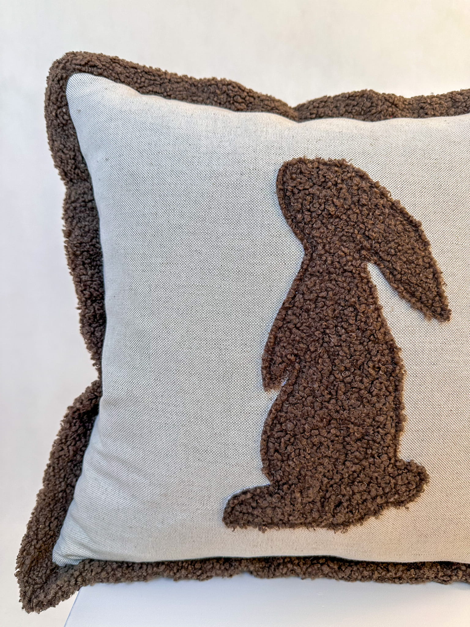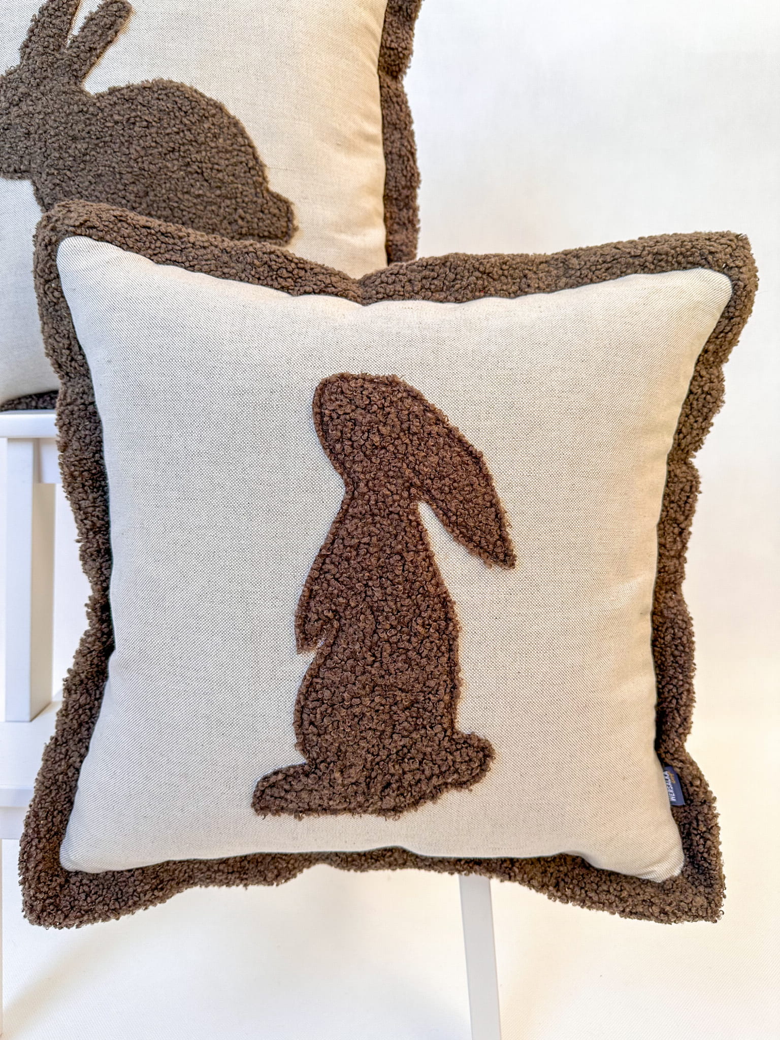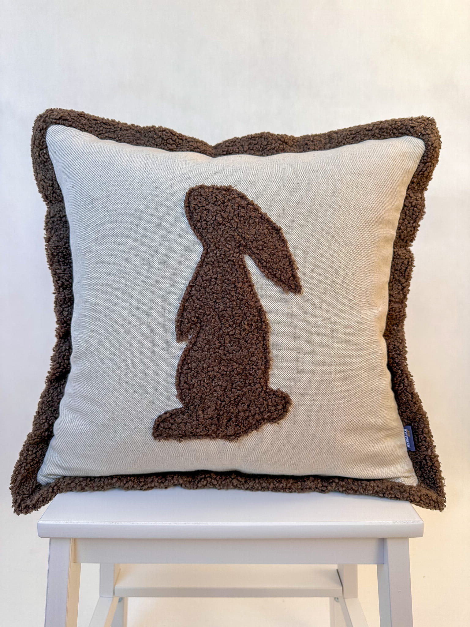 Nasza poszewka z naturalnej bawełny z uroczym brązowym zającem z boucle to idealny dodatek do każdego pokoju. Zaproś do swojego domu odrobinę natury i przytulności.