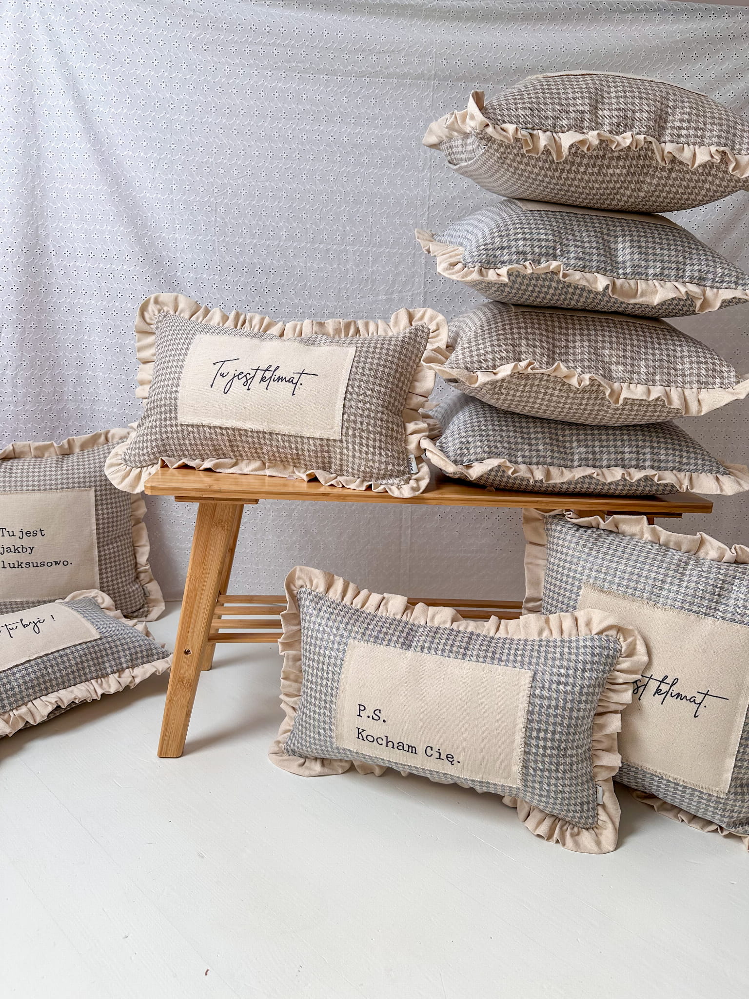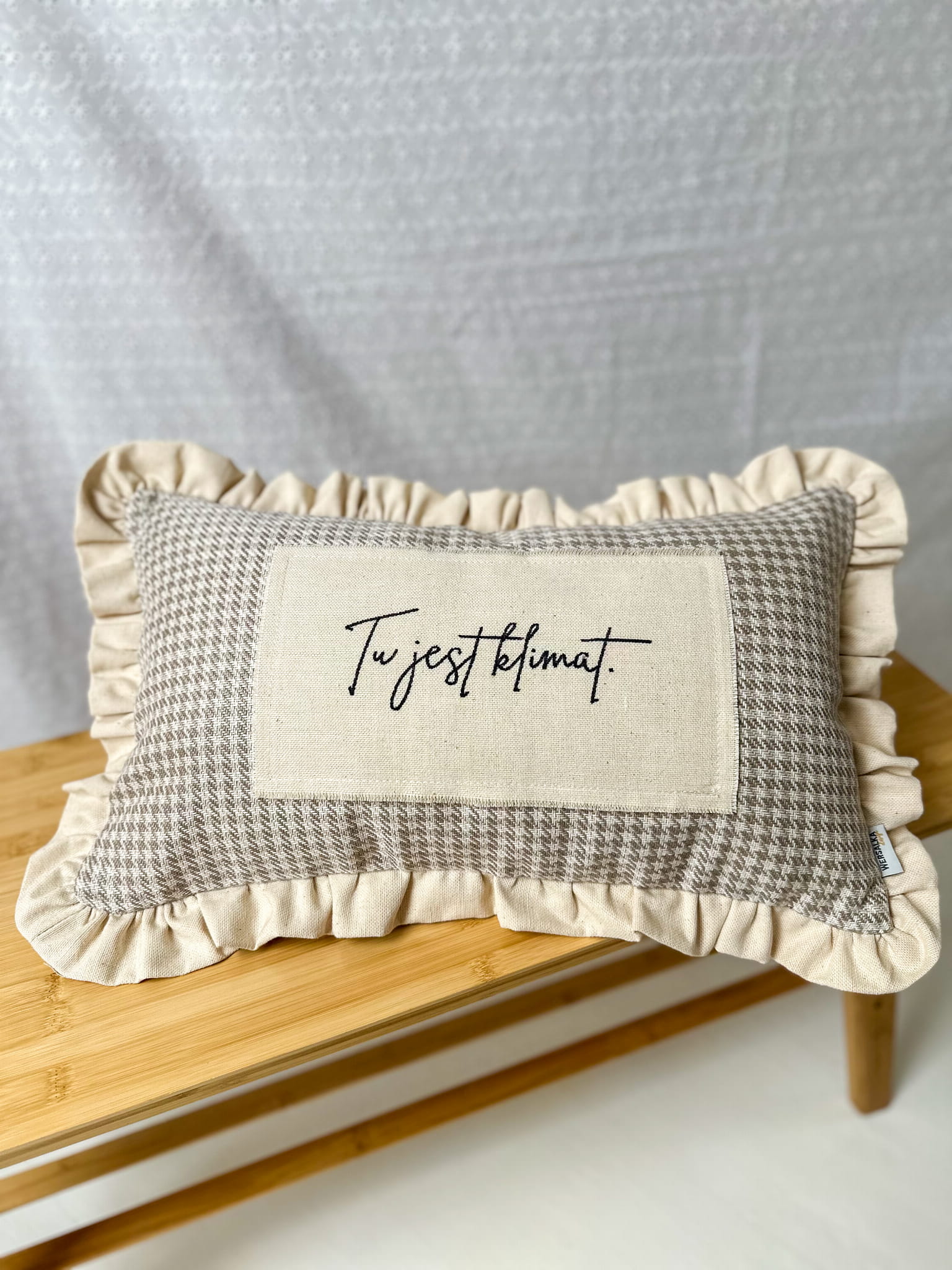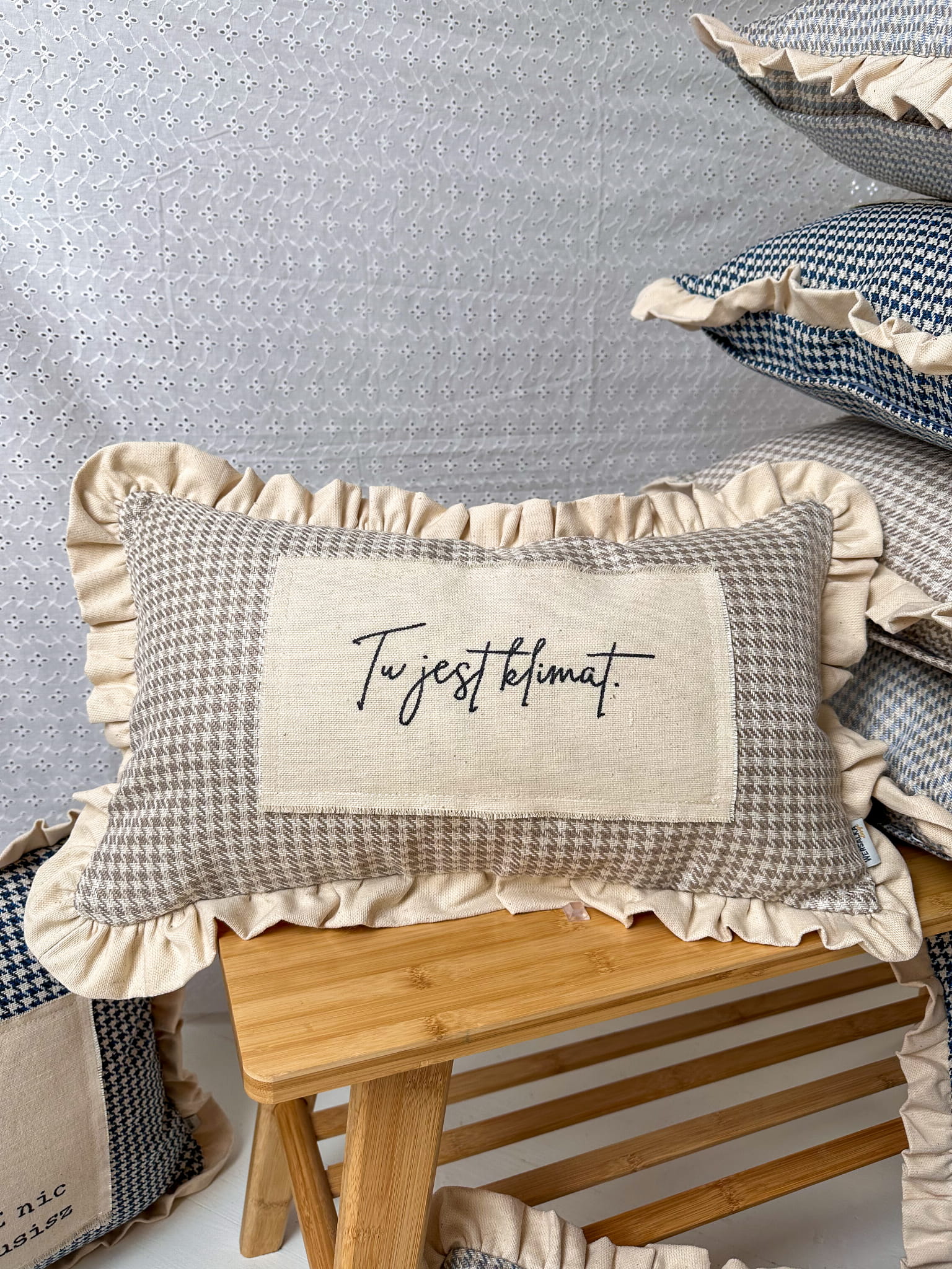 Poszewka w beżową pepitkę z napisem Tu jest klimat.