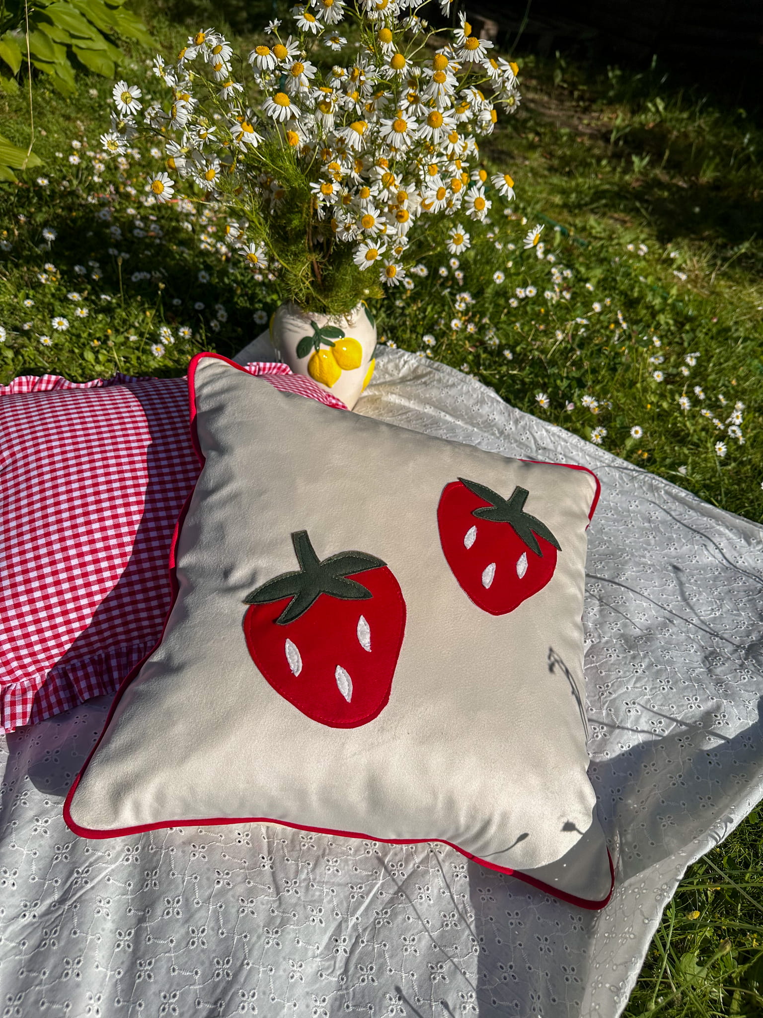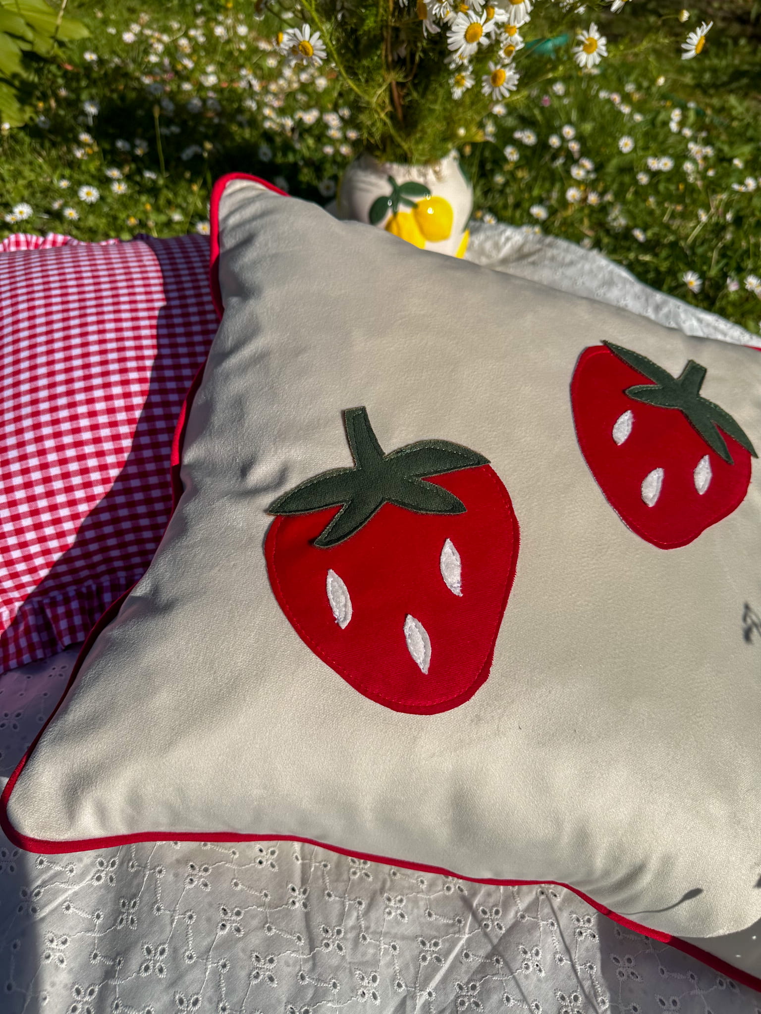 Poszewka z truskawkami – biała poduszka z naszywkami 45x45 cm